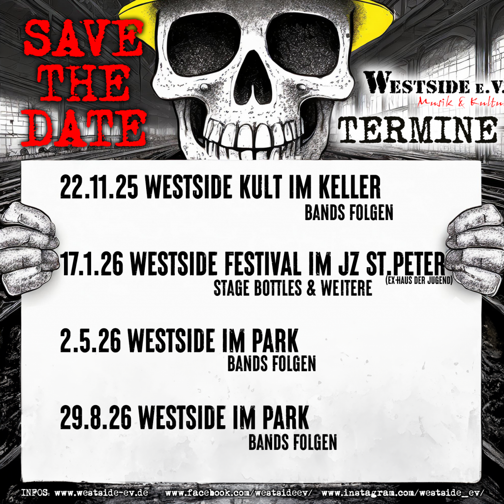 das Jahr ist jung, die Vorsรคtze noch frisch, und wir haben heiรen Stoff fรผr deinen Kalender: Die ersten Konzerttermine 2025 von Westside e.V. stehen! Hol die Stifte raus, setz die Reminder und mach dich bereit fรผr pure Energie und jede Menge Punkrock in Duisburg-Rheinhausen.