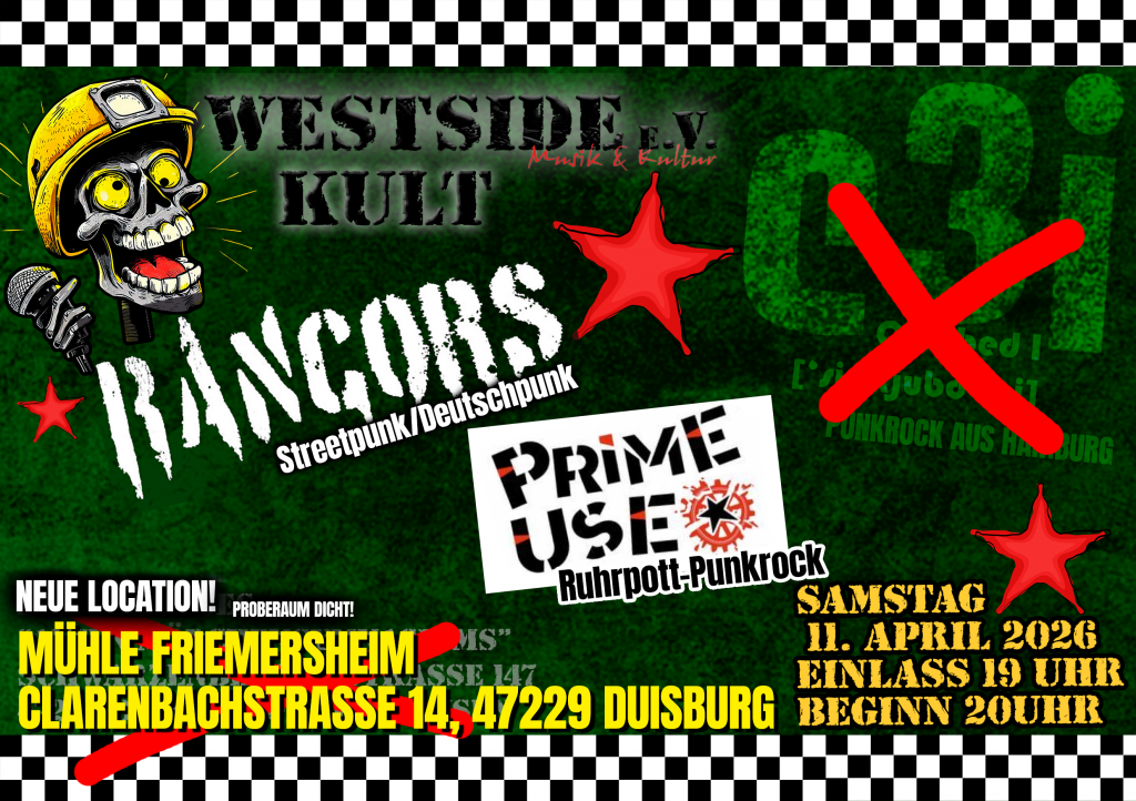11.04. WESTSIDEKULT mit Rancors, Prime use, C3i findet im JZ Mรผhle am Bahnhof Rheinhausen statt – NICHT im Keller!